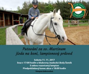 V sobotu 11.11.2017, sraz je v 17 hodin u klubovny jezdecké školy Šemík, sebou si prosím přineste rozsvícený lampion.